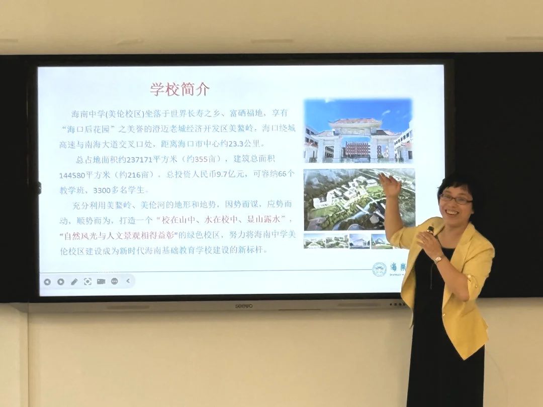 海南中学美伦校区执行校长吴爱姣(外国语学院优秀校友)对海师一行的到访表示诚挚欢迎,并特别介绍了三位在海中教学一线表现突出的海师校友代表。她高度赞赏海师"青年教师助力工程"的创新实践和深入调研的工作作风并分享了美伦校区办学四年来取得的显著成绩:在教育教学改革、中高考成绩等方面实现重大突破。形成了以"四个一"为核心的教育理念体系。