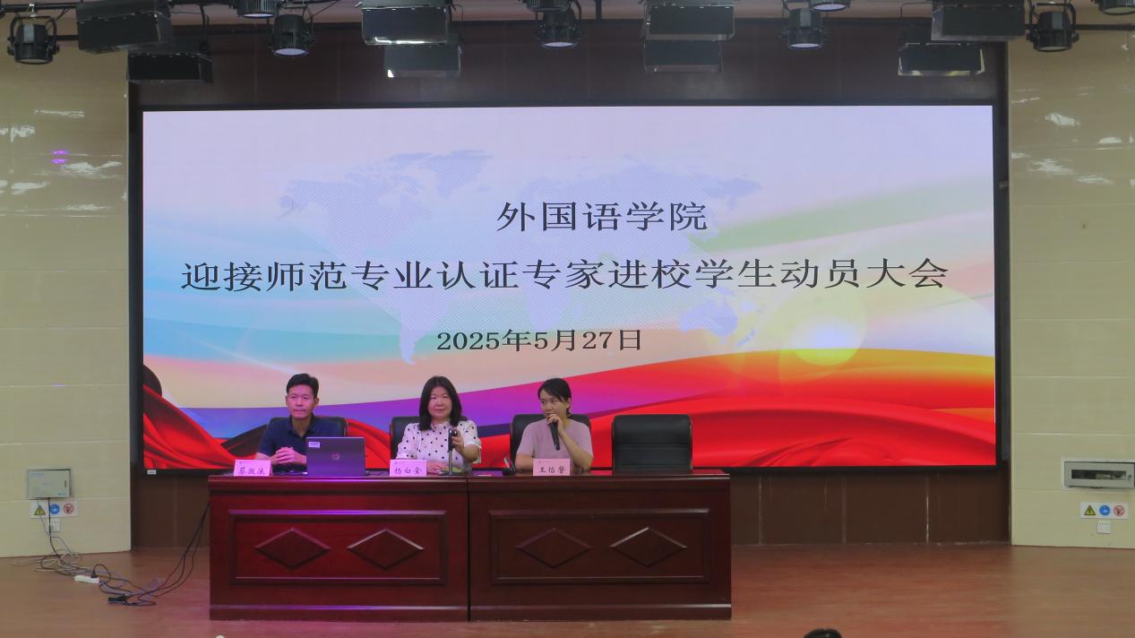 为迎接2025年教育部英语师范专业认证专家进校考察,5月27日,海南师范大学外国语学院于外语楼110报告厅分四批召开学生动员大会。出席本次大会的有外国语学院党委副书记杨白全、学院副院长蔡激浪及各年级辅导员。外国语学院22级、23级、24级全体本科生分批参会。